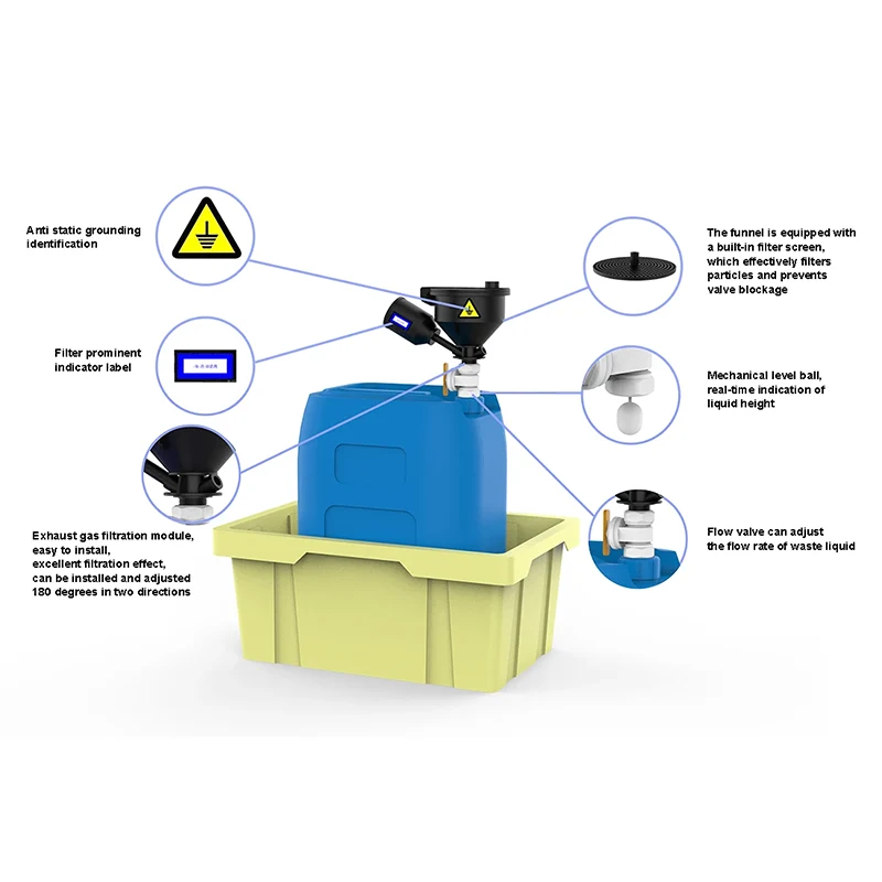 Piranti pangumpulan cairan sampah nduweni ciri sing luar biasa. Wadhah koleksi kasebut digawe saka bahan baku PP anti-statis sing diimpor, sing ora mung njamin stabilitas materi nanging uga efektif nindakake fungsi agen antistatik, ngontrol listrik statis corong cairan sampah ing kisaran 10 ^ 5 nganti 10 ^ 9, nyuda resiko bencana sing disebabake dening listrik statis. Corong nduweni desain sing canggih. Tutup ndhuwur anti bocor dipasangake karo tutup sealing lan corong saringan anti cipratan, lan katup bisa dipasang yen perlu kanggo njamin keamanan panyimpenan cairan sampah. Tutup ndhuwur jinis counterweight kanthi otomatis nyetel emisi gas exhaust miturut kondisi tekanan internal mbukak ing 100Pa lan nutup ing 50Pa, ngindhari bledosan lan pembakaran spontan. Filter gas exhaust disambungake kanthi cara spiral, sing trep kanggo ngganti lan nyegah volatilisasi komponen kimia. Ana 5 macem-macem jinis sing kasedhiya kanggo adaptasi sing tepat kanggo macem-macem perawatan gas buang.